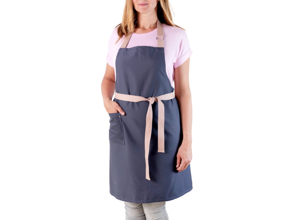 Ušili jsme ji s láskou z odolného a příjemného materiálu (65 % polyester, 35 % bavlna). Má praktickou kapsu na pravém boku, do které schováte telefon, kuchařský tahák nebo zastrčíte utěrku. Nechybí ani nastavitelný kovový průvlek kolem krku a dlouhé bavlněné vázačky, které si zavážete přesně tak, jak potřebujete – vzadu, vpředu, na mašli i bez.