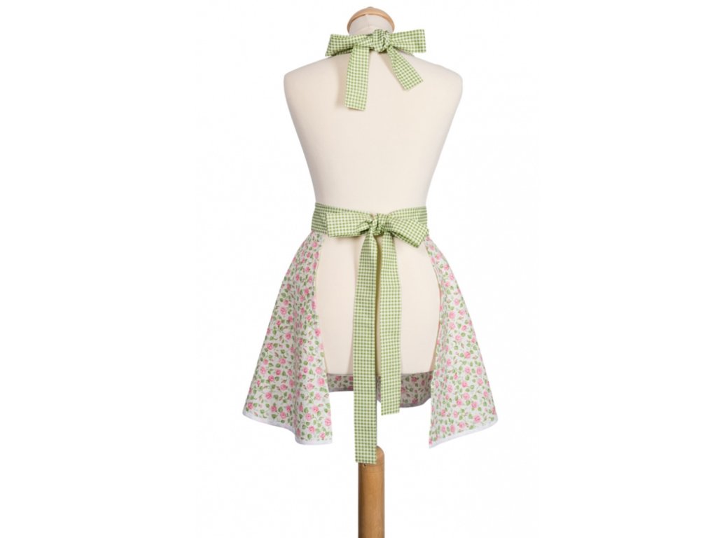 Zástěra s jemným růžičkovým vzorem z české látky ze 100% bavlny. Jejím stylovým doplňkem je květinová brož, kterou můžete použít i jako ozdobu do vlasů.