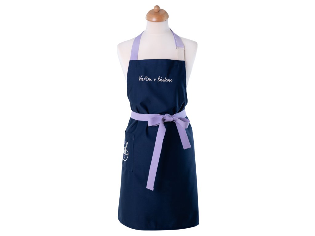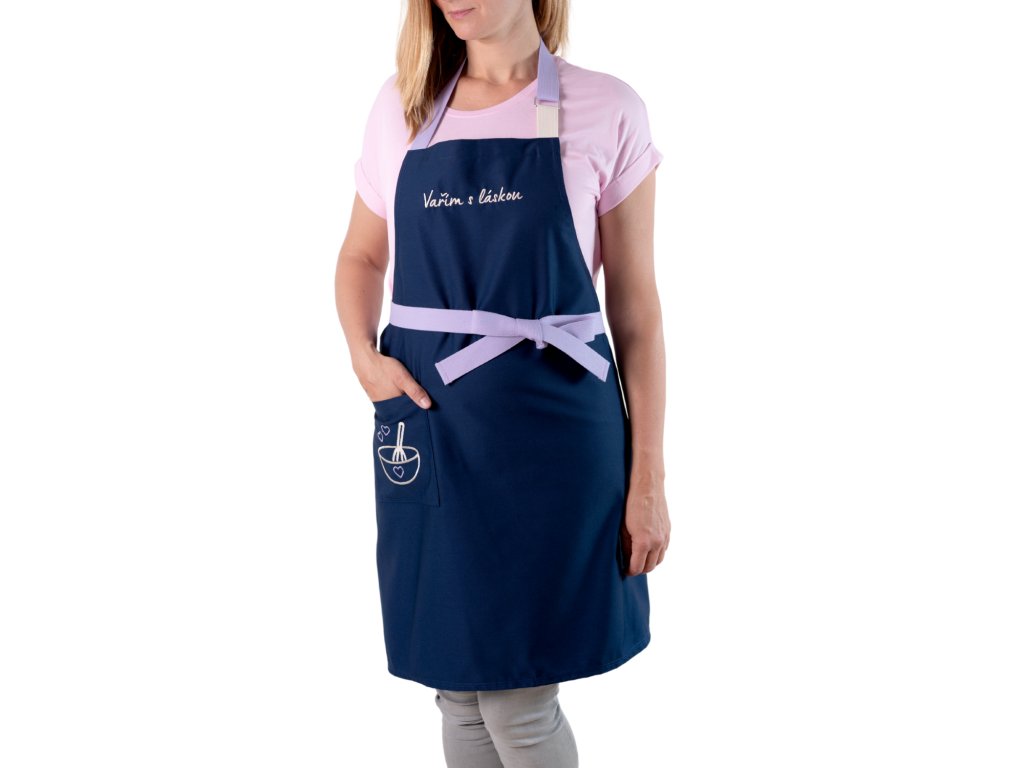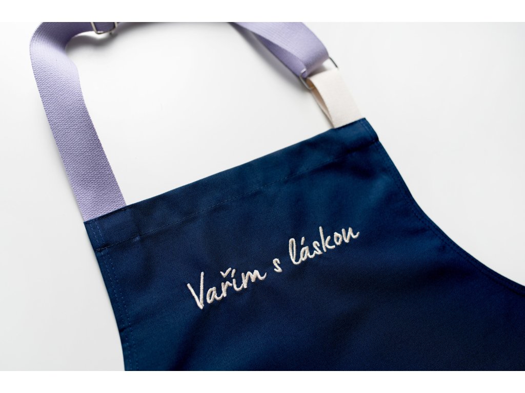 Láska je nejlepší ingredience – a tahle zástěra je toho důkazem. Tmavěmodrou kuchyňskou zástěru s výšivkou „Vařím s láskou“ jsme navrhli s maximální péčí do posledního detailu a ušili tak, aby vám v ní bylo nejen pohodlně, ale i krásně.