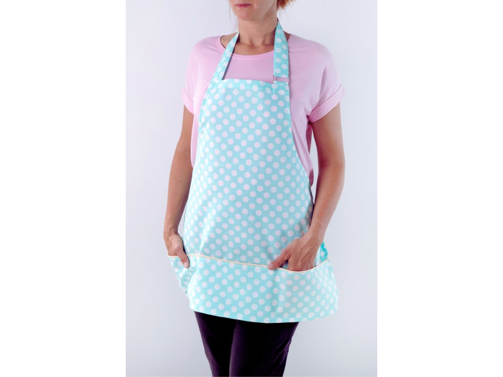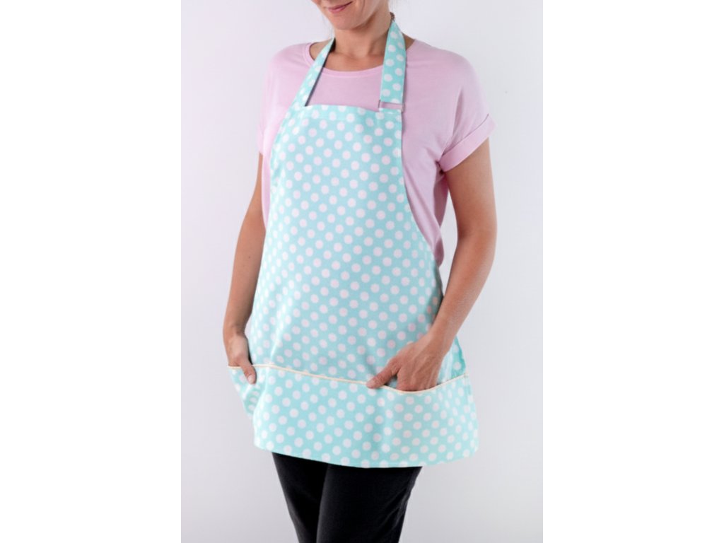 Zástěru v jemné mentolové barvě s puntíky jsme pro vás s láskou ušili z lehké 100% bavlny, kterou jsme si jen pro nás nechali vyrobit u českého výrobce ve Dvoře Králové.