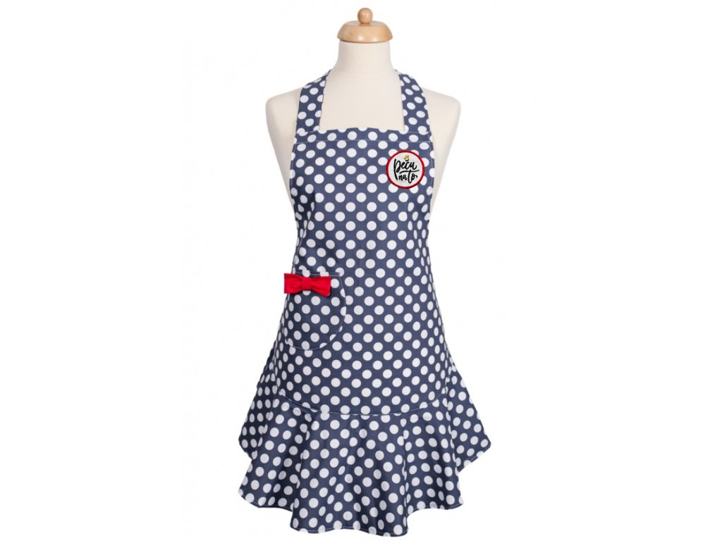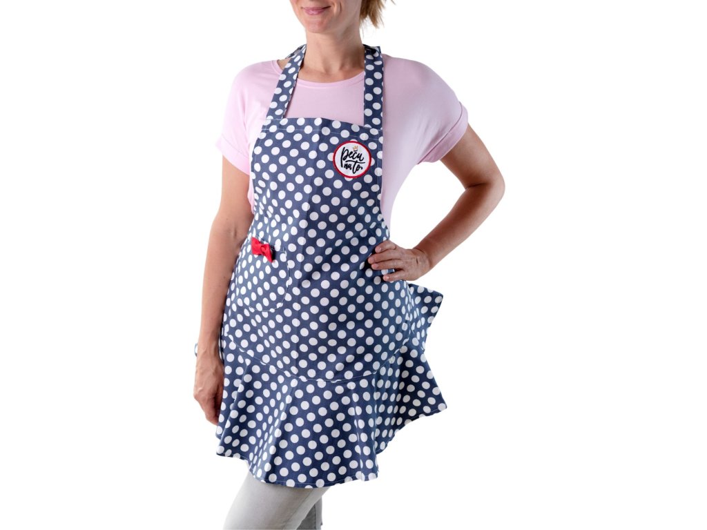 Modrá zástěra s puntíky a výšivkou Peču na to