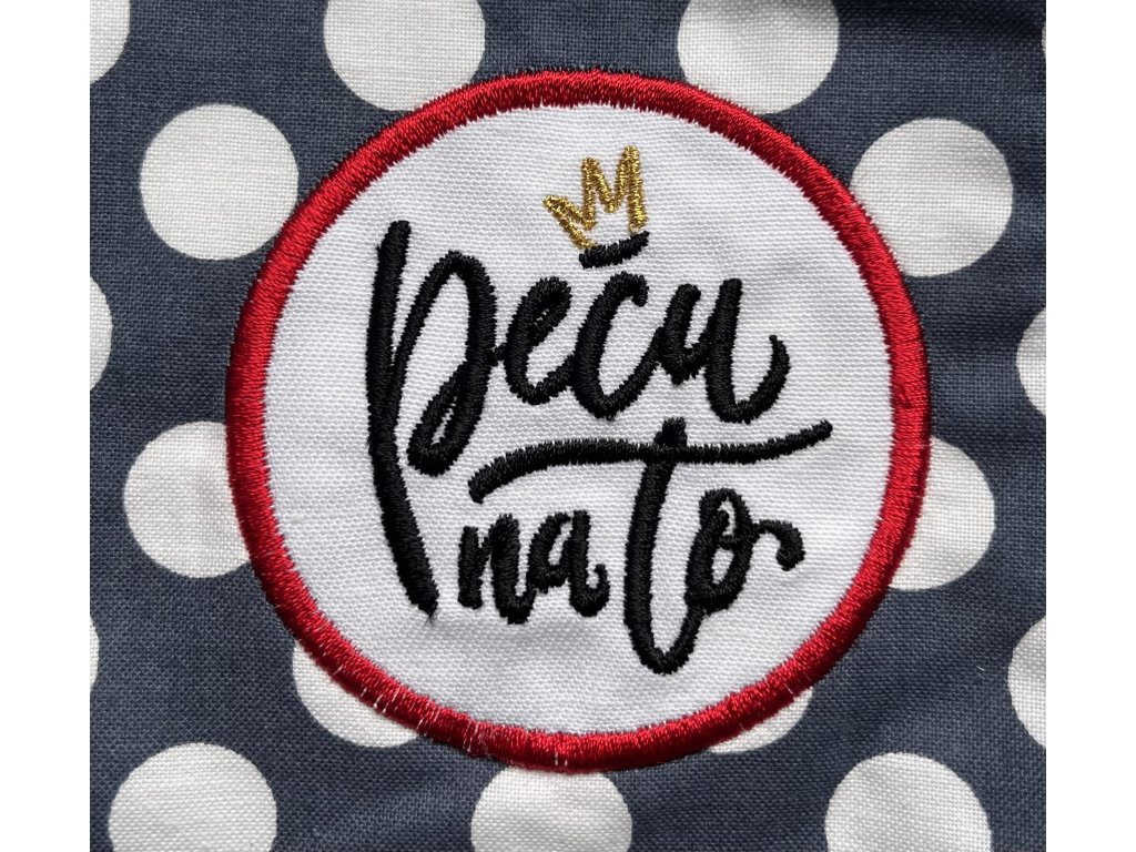 Šik zástěra na vaření v praktické modré barvě s originální výšivkou Peču na to. Má stylový retro střih, univerzální velikost a je s láskou ušitá z lehké 100% bavlny.