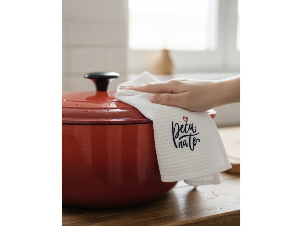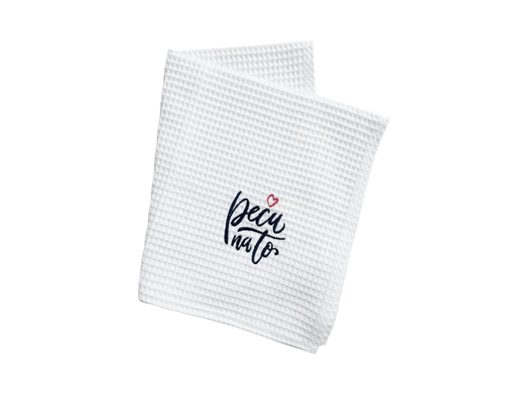 Utěrka do kuchyně z kvalitního savého materiálu, originální výšivkou Peču na to a praktickým poutkem na knoflík.