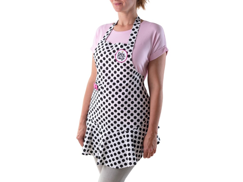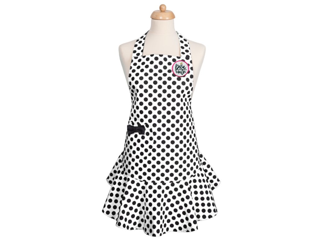 Šik zástěra na vaření v elegantní bílé barvě se vzorem černých puntíků a originální výšivkou Peču na to. Má stylový střih, univerzální velikost a je s láskou ušitá z lehké 100% bavlny.